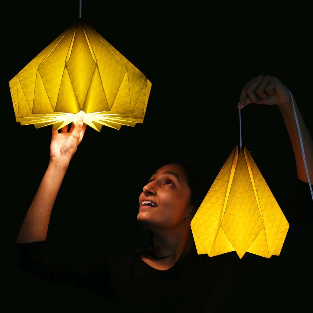 Our origami-inspired lamp has been put together using the finest quality of the paper. Each piece has been prepared with great care and exceptional craftsmanship to cater to your aesthetic needs for home decor.“All our products are handcrafted with utmost workmanship. The attention to detail and artistic brilliance that our home-trained team of differently abled people brings to the table makes our products special and unique.” Colour: Yellow Design: Plain Package content: 2 small origami Lamp shade; Join them together to make a bigger lamp as shown in image. Handcrafted pendant lamp shade. Can be used on any hanging light source (Bulb and holder is not included). Flat Packed Paper Origami Lamp Shade. Modular design with easy snap assembly Compatible with "LED" Light Bulb. A 9watt-3000k (warm white) LED bulb is used in the lamp shown in the image Easy assembly, Ideal for Home Decor Handcrafted by specially abled people Colour: Yellow Design: Plain Package content: 2 small origami Lamp shade; Join them together to make a bigger lamp as shown in image. Handcrafted pendant lamp shade. Can be used on any hanging light source (Bulb and holder is not included). Flat Packed Paper Origami Lamp Shade. Modular design with easy snap assembly Compatible with "LED" Light Bulb. A 9watt-3000k (warm white) LED bulb is used in the lamp shown in the image Easy assembly, Ideal for Home Decor Handcrafted by specially abled people