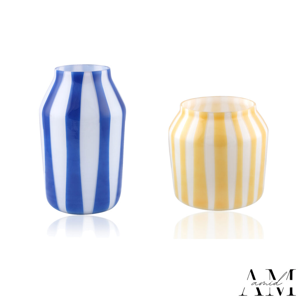 This vase is a delightful home for your favorite blooms. Made from glass, it features yellow & white stripes, this bold vase will brighten any corner. Relish your admiration for cheerful vibes with this textured glass vase. Its ethnic contour, this appealing piece of decor makes for a perfect companion which is all set to augment the grace of your festive dining arrangements. Works as a Home Décor, Bedroom, Living room. Material – Mouth Blown Glass. Dimensions – 9*9 Inches SKU – AMID-YGRV02 Colour – White & Yellow Care Instructions – Wipe clean with a slightly damp cloth Package Included – One piece Dimensions will vary per piece